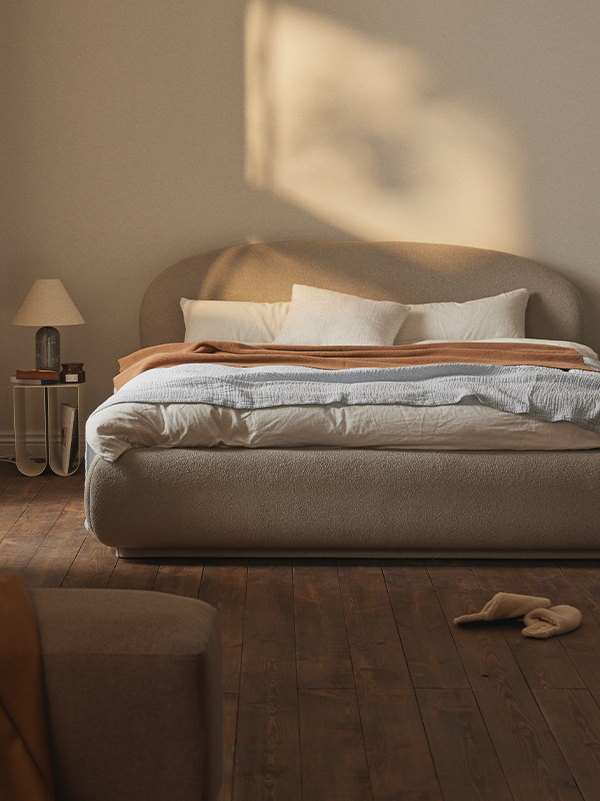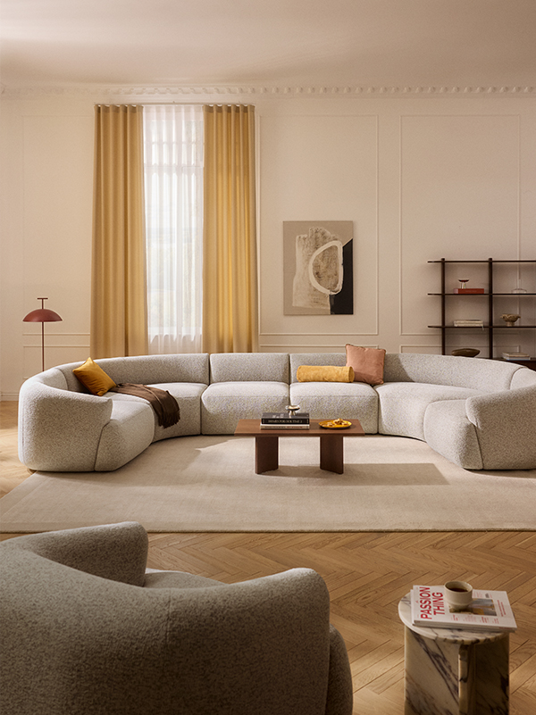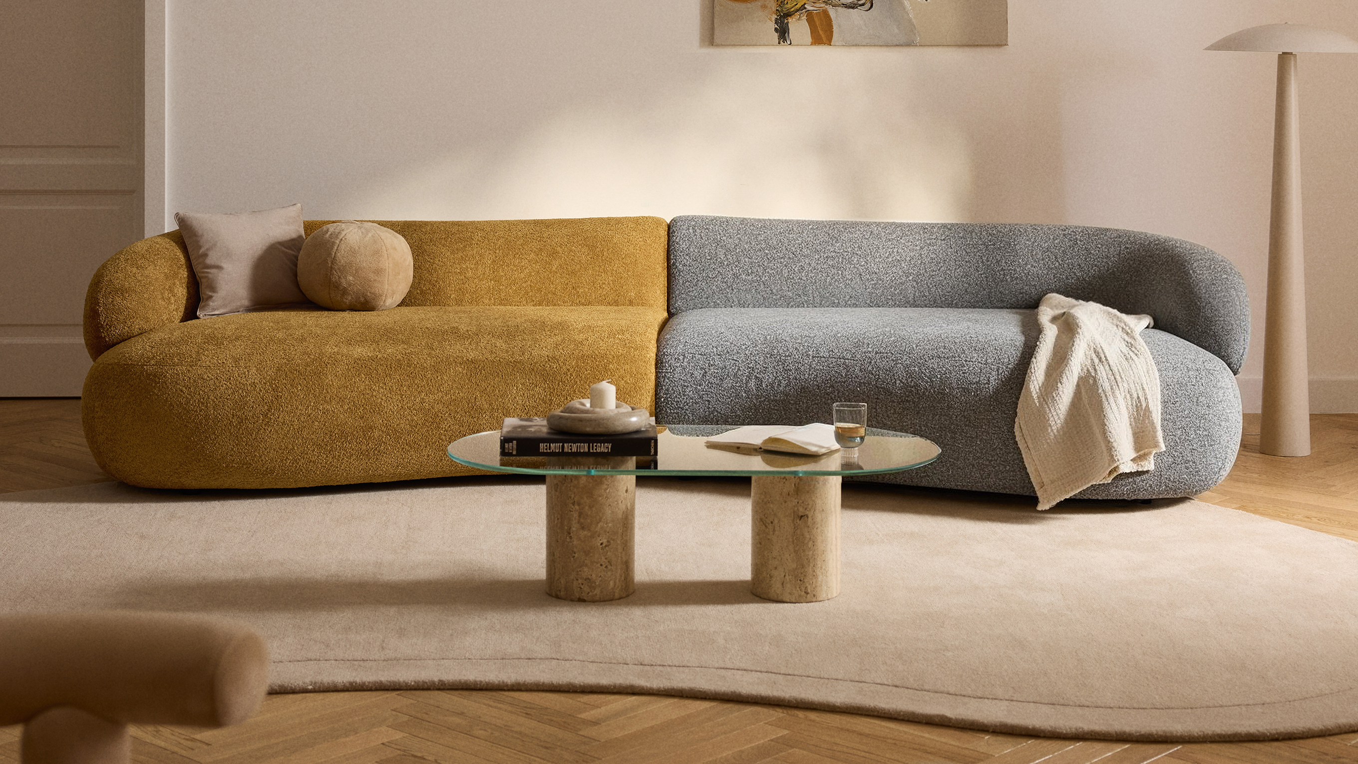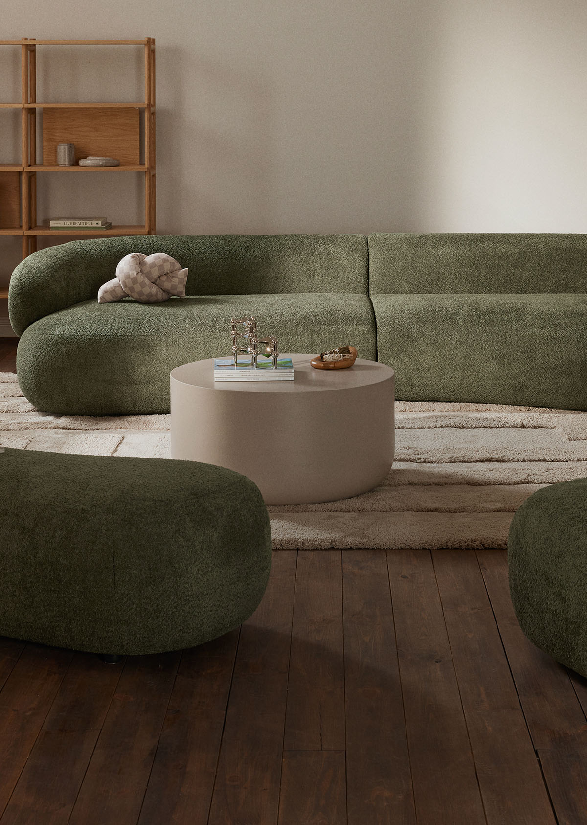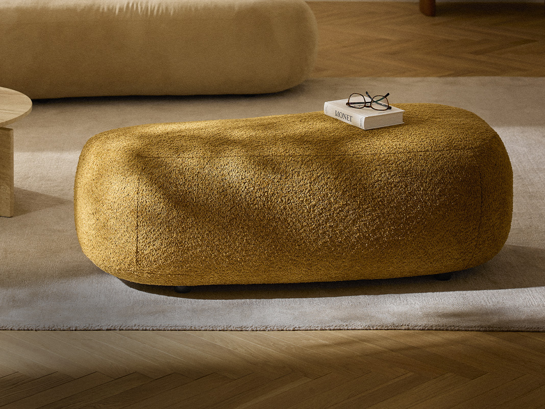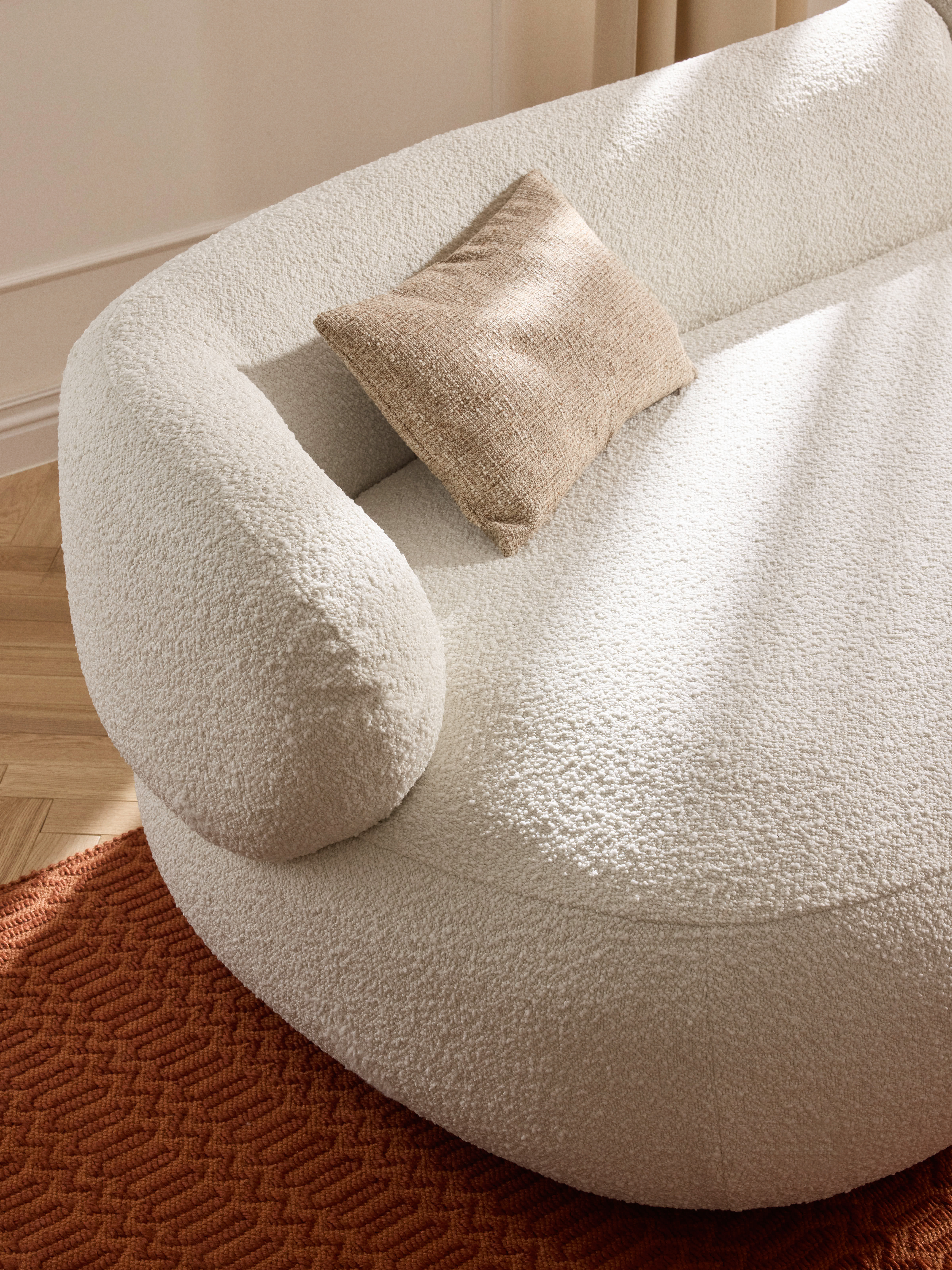 Alba ist in samtigen Bezügen, gemusterten Webstoffen und Teddy-Bouclés erhältlich. Die Palette reicht von sanften Neutrals bis zu warmen Akzentfarben.