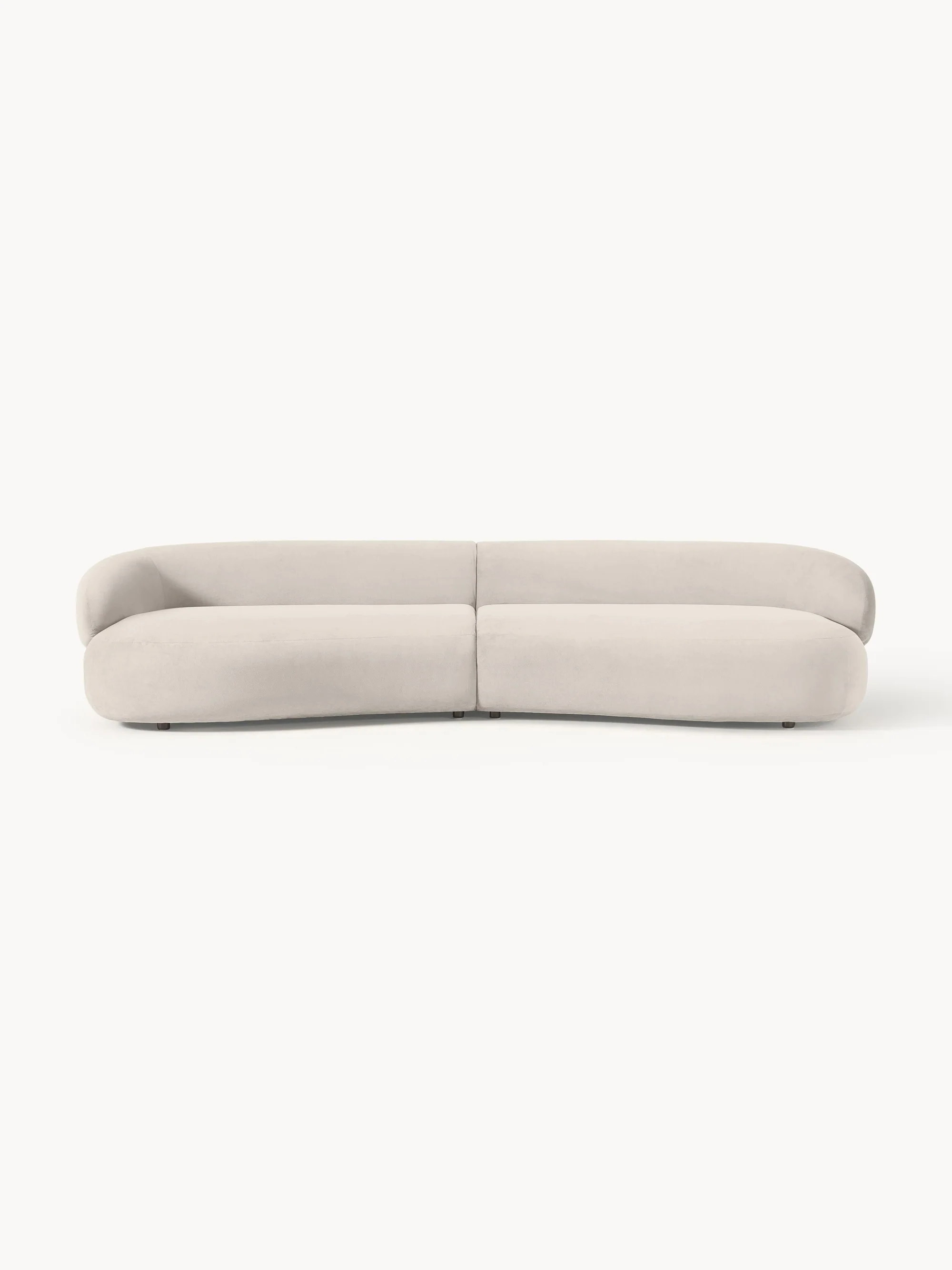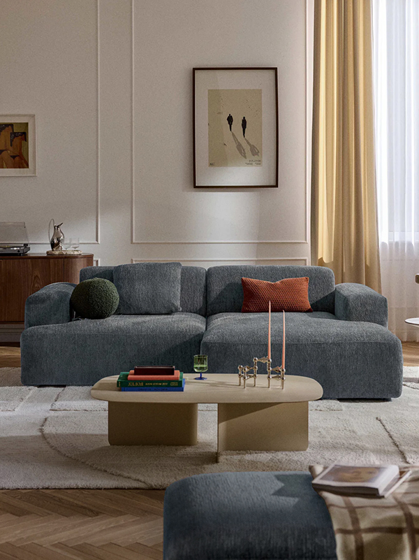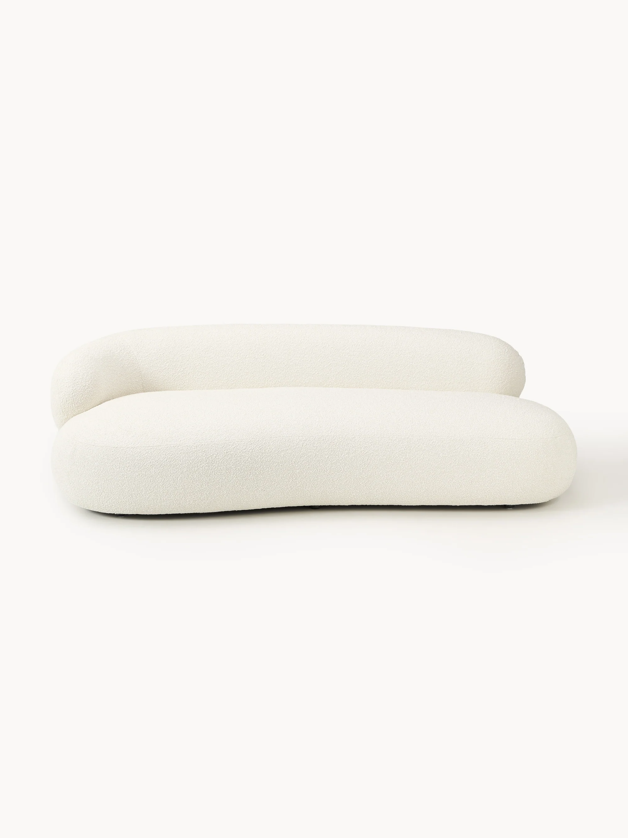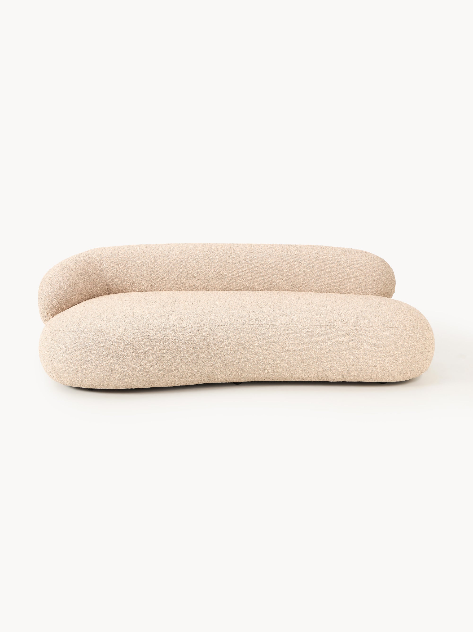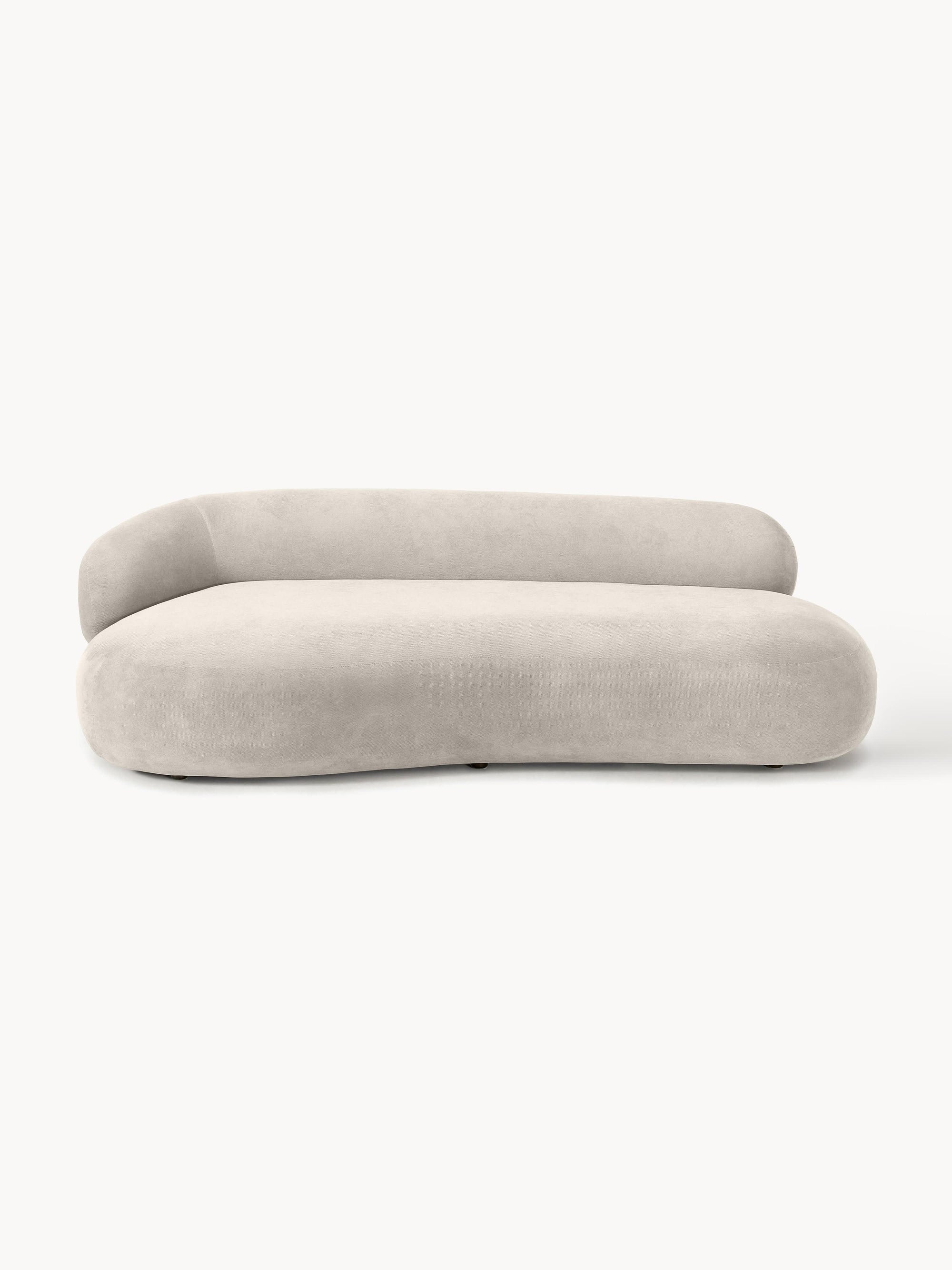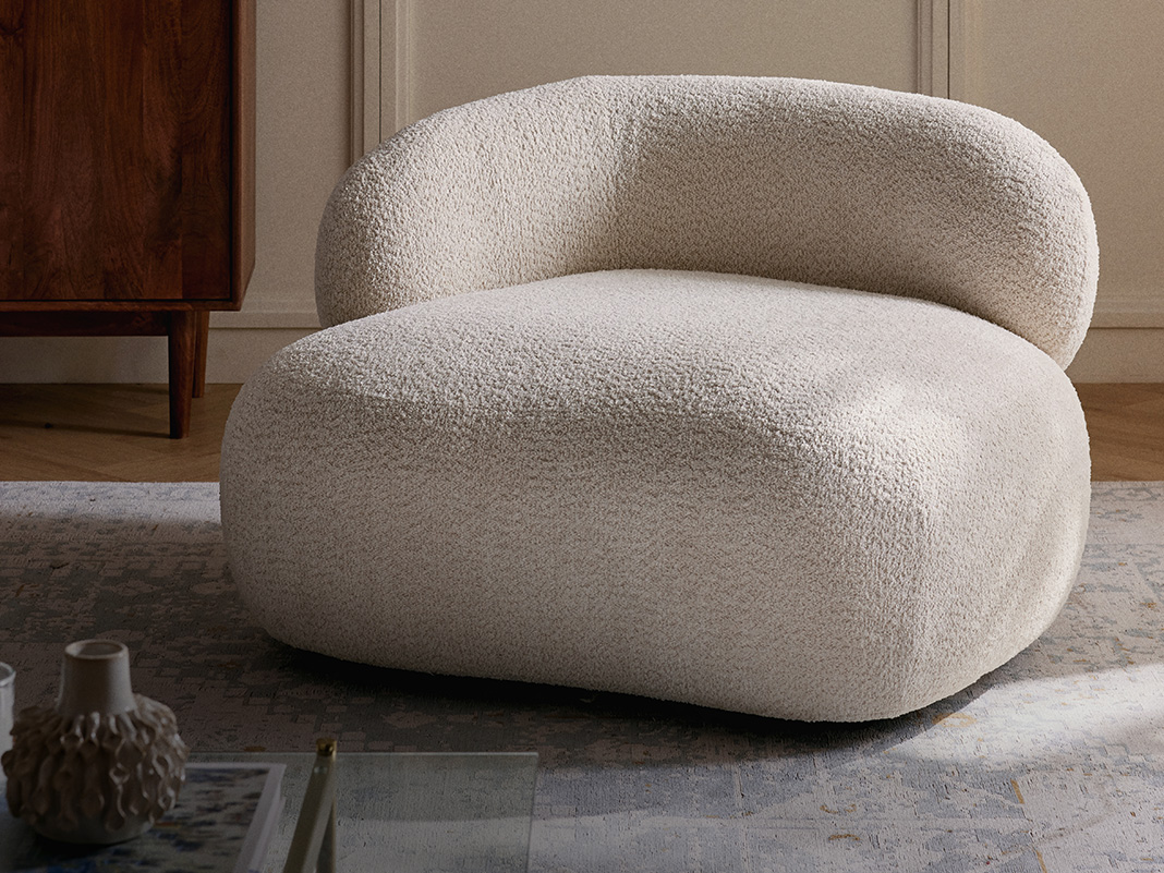 Alba ist in samtigen Bezügen, gemusterten Webstoffen und Teddy-Bouclés erhältlich. Die Palette reicht von sanften Neutrals bis zu warmen Akzentfarben.