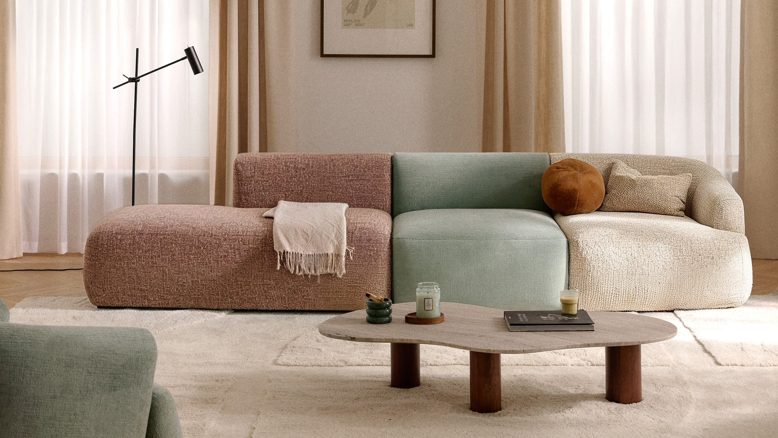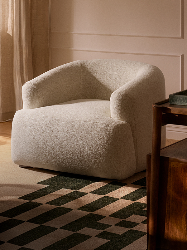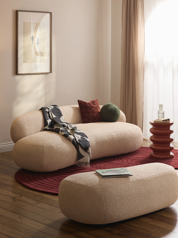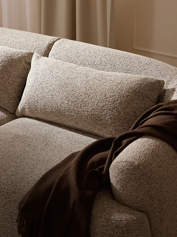 SOFIA ist in einer ausgewählten Palette aus samtigen Bezügen, gemusterten Webstoffen und Teddy-Bouclés erhältlich, die von sanften Neutrals über warme Erdtöne bis zu modernen Akzentfarben reichen.